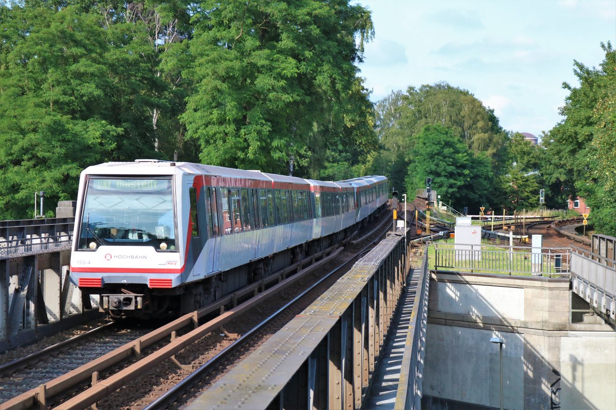 Hochbahn Hamburg DT4 Wagen 193 am 17.07.19 in Hamburg Wandsbek Gartenstadt vom Bahnsteig aus fotografiert per Telezoom