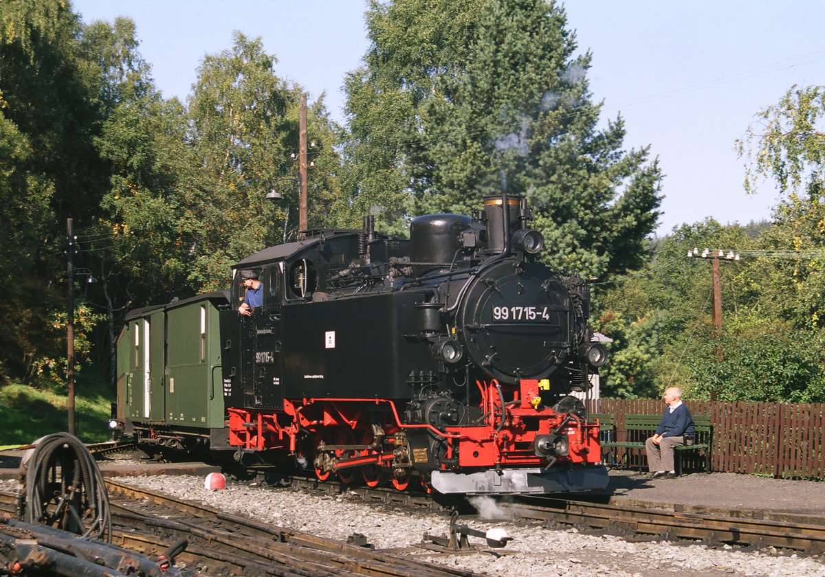 16. September 1984: Feier  100 Jahre Schmalspurbahn Radebeul - Radeburg . Vor dem Lokschuppen im Bahnhof Radeburg wird die sä VIK 99 713 (1927 Hartmann) für die Rückfahrt mit dem Sonderzug restauriert.