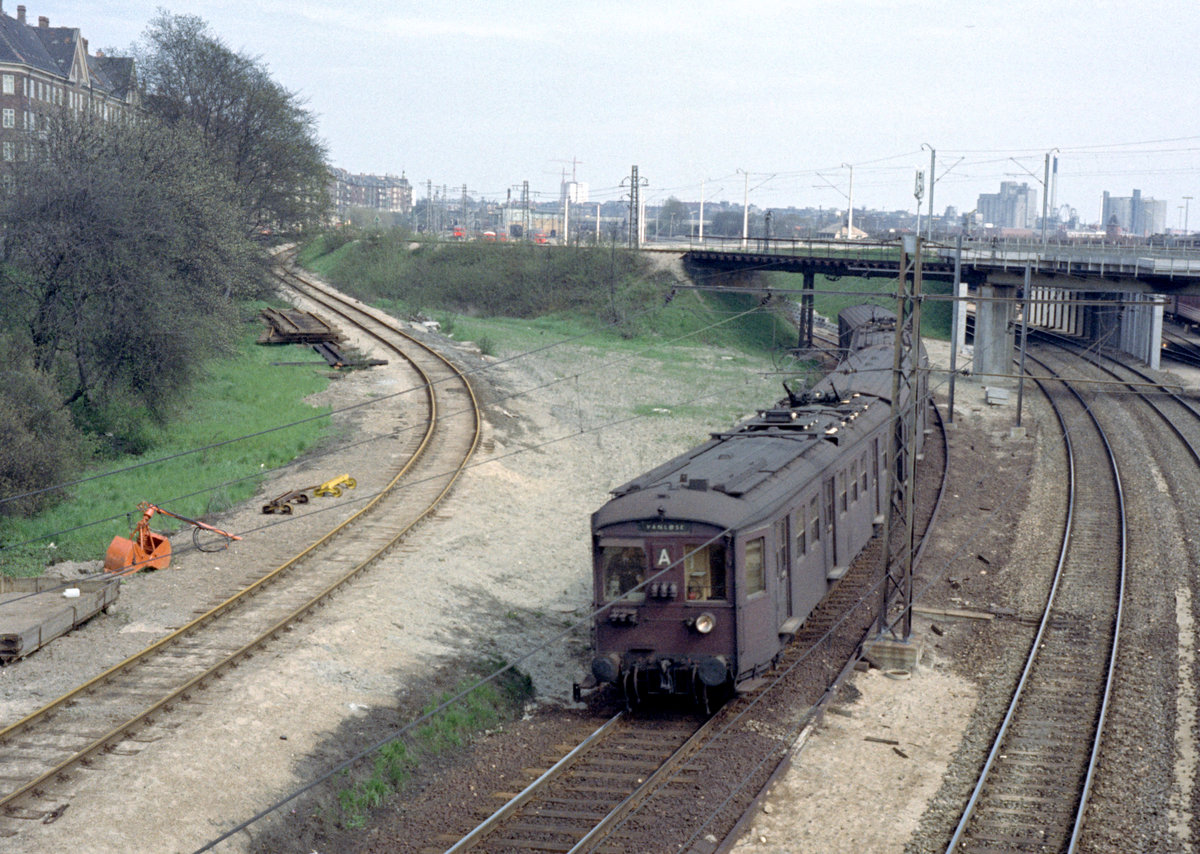 DSB S-Bahn Kopenhagen: Eine Garnitur der ersten Kopenhagener S-Bahngeneration (MM+FS+MM+FS) befindet sich am 30. April 1972 kurz vor dem S-Bahnhof Enghave, der 2016 durch den neuen S-Bahnhaltepunkt Carsberg ersetzt wurde. - Das Gleis links war das Verbindungsgleis zur Brauerei Carlsberg. Zu der Zeit wurden die Carlsberg-Erzeugnisse noch am ursprünglichen Standort der Brauerei gemacht; heute findet die Produktion in Fredericia in Jütland statt. - Scan eines Farbnegativs. Film: Kodak Kodacolor X. Kamera: Kodak Retina Automatic II.