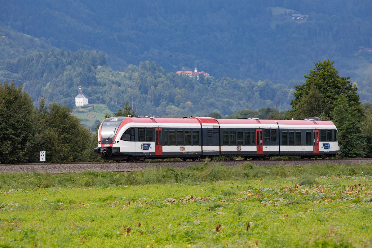 An diesem teilweise trüben 22.August 2019 rollt wieder einmal ein GTW 2/8 in die Halte Stelle St.Peter im Sulmtal.