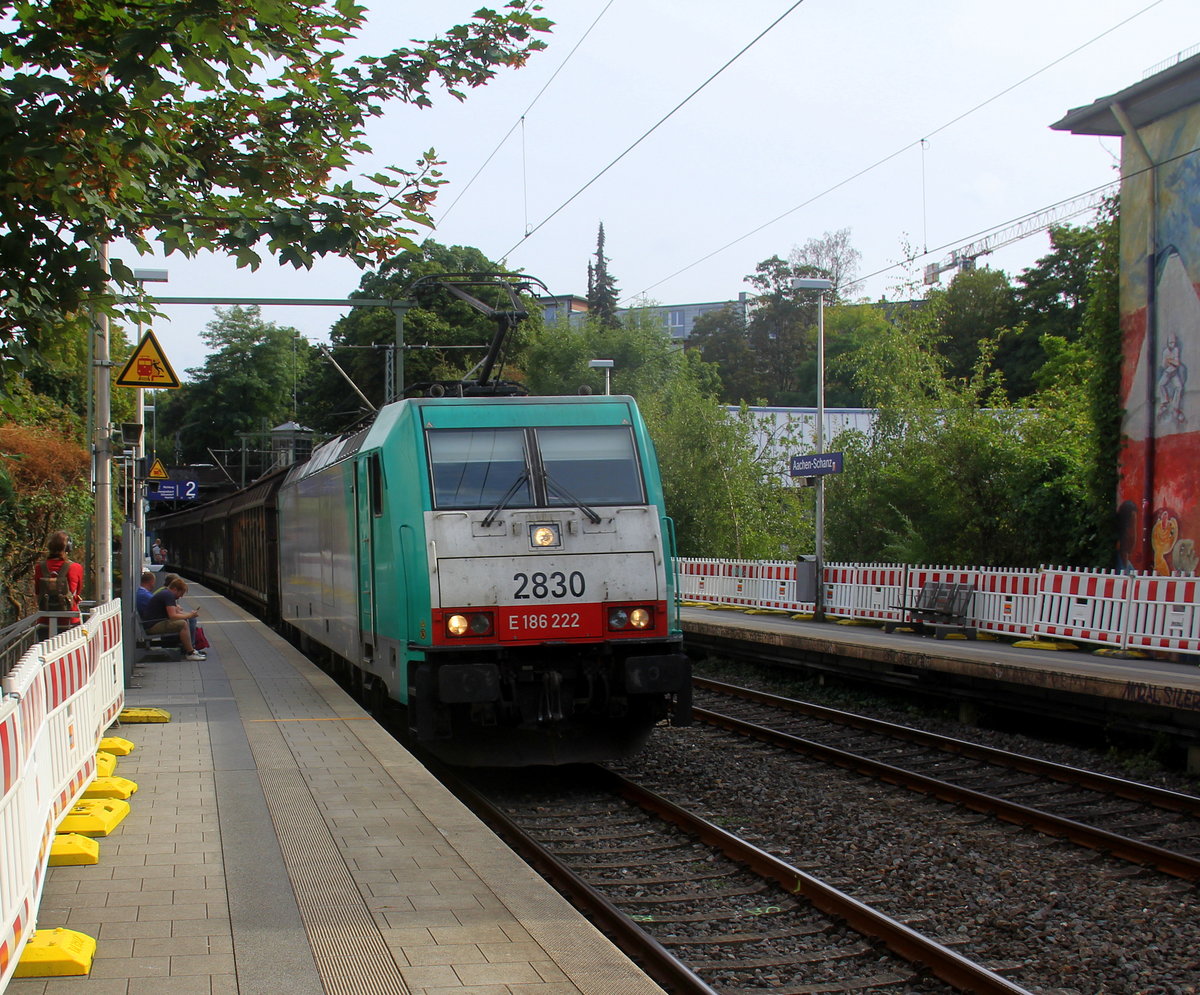 Die Cobra 2830 kommt aus Richtung Köln,Aachen-Hbf mit einem langen Papierzug aus Köln-Gremberg nach Zeebrugge(B) und fährt durch Aachen-Schanz in Richtung Aachen-West. Aufgenommen vom Bahnsteig von Aachen-Schanz. Bei Sommerwetter am Nachmittag vom 21.8.2019.