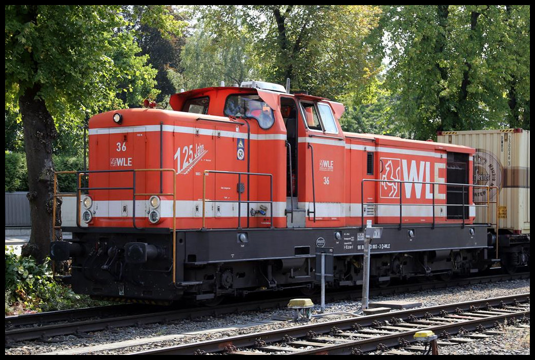 WLE Lok 36 war am 23.08.2019 mit dem Bierzug der Warsteiner Brauerei unterwegs. Im Bahnhof Erwitte gab es ein Problem mit den Bremsen des ersten Wagen und der Zug blieb einige Stunden liegen.