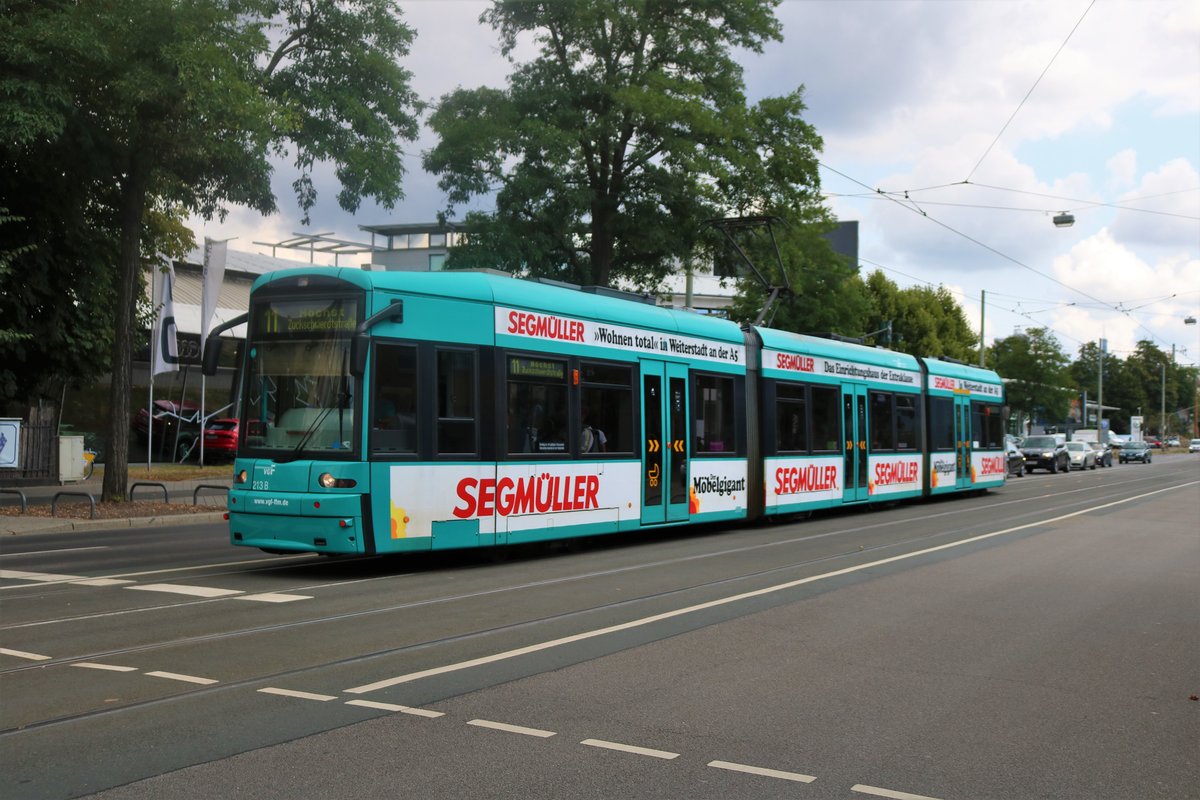 VGF Bombardier Flexity Classic S-Wagen 213 am 03.08.19 in Frankfurt am Main Nied
