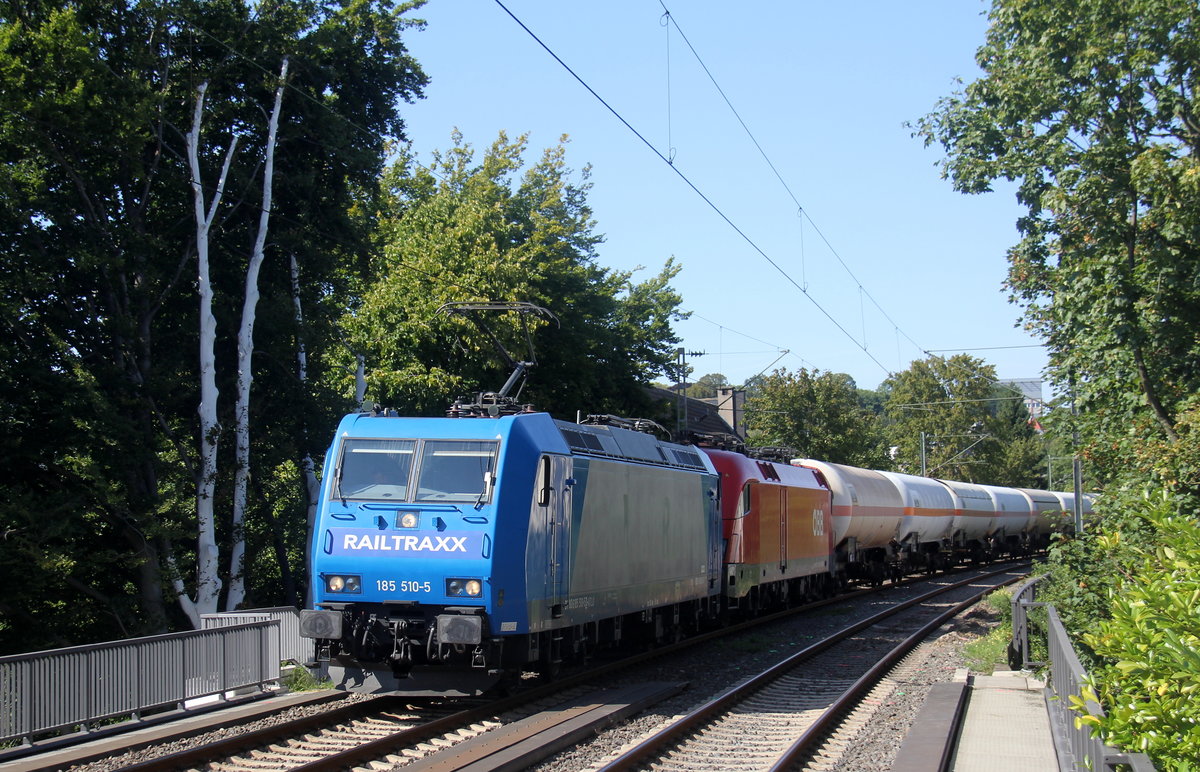185 510-5 von Railtraxx und 1116 277-5 von ÖBB kommen aus Richtung Aachen-West mit einem gemischten Güterzug aus Antwerpen-Waaslandhaven(B) nach Linz-Voestalpine(A) und fahren durch Aachen-Schanz in Richtung Aachen-Hbf,Aachen-Rothe-Erde,Stolberg-Hbf(Rheinland)Eschweiler-Hbf,Langerwehe,Düren,Merzenich,Buir,Horrem,Kerpen-Köln-Ehrenfeld,Köln-West,Köln-Süd. Aufgenommen vom Bahnsteig von Aachen-Schanz. Bei Sommerwetter am Nachmittag vom 22.8.2019.