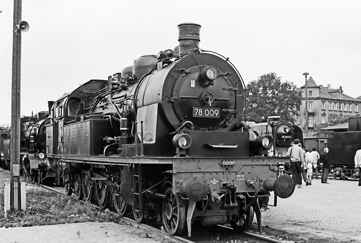 18. August 1984, Lokschau im Bahnhof Radebeul-Ost. Auch die 1912 als  Stettin 8409  bei der KPEV in Dienst gestellte und 1963 bei der DR ausgemusterte Personenzug-Tenderlok 78 009 des Verkehrsmuseums Dresden zeigt sich den Besuchern.