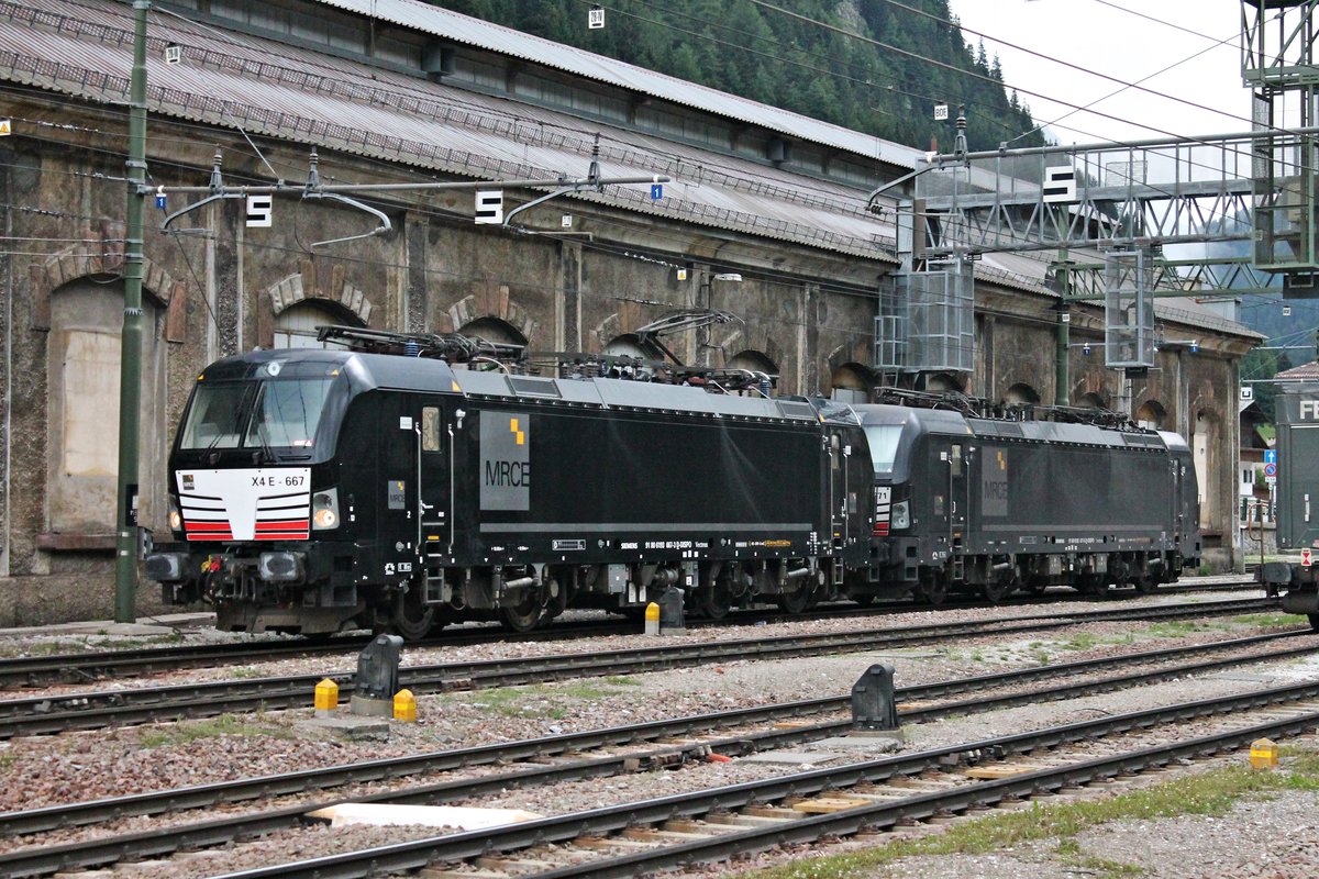 Am 05.07.2018 setzten MRCE/TXL ES 64 F4-098 (189 998-8) und MRCE/TXL ES 64 F4-086 (189 986-3) von ihrem KLV im Bahnhof von Brennero ab, damit MRCE/TXL X4 E-667 (193 667-3) und MRCE/TXL X4 E-671 (193 671-5) den KLV weiter nach Verona Q. E. zu übernehmen.