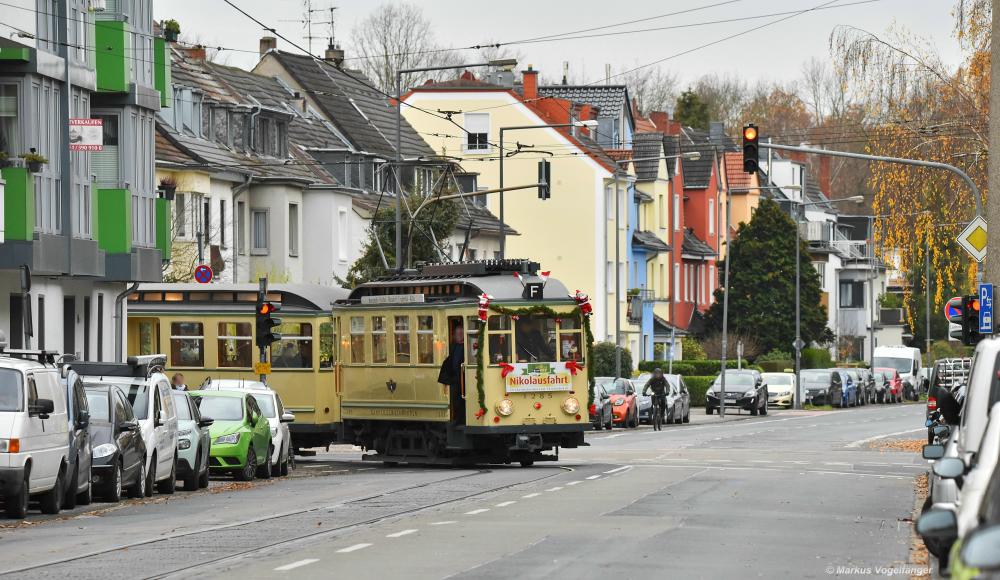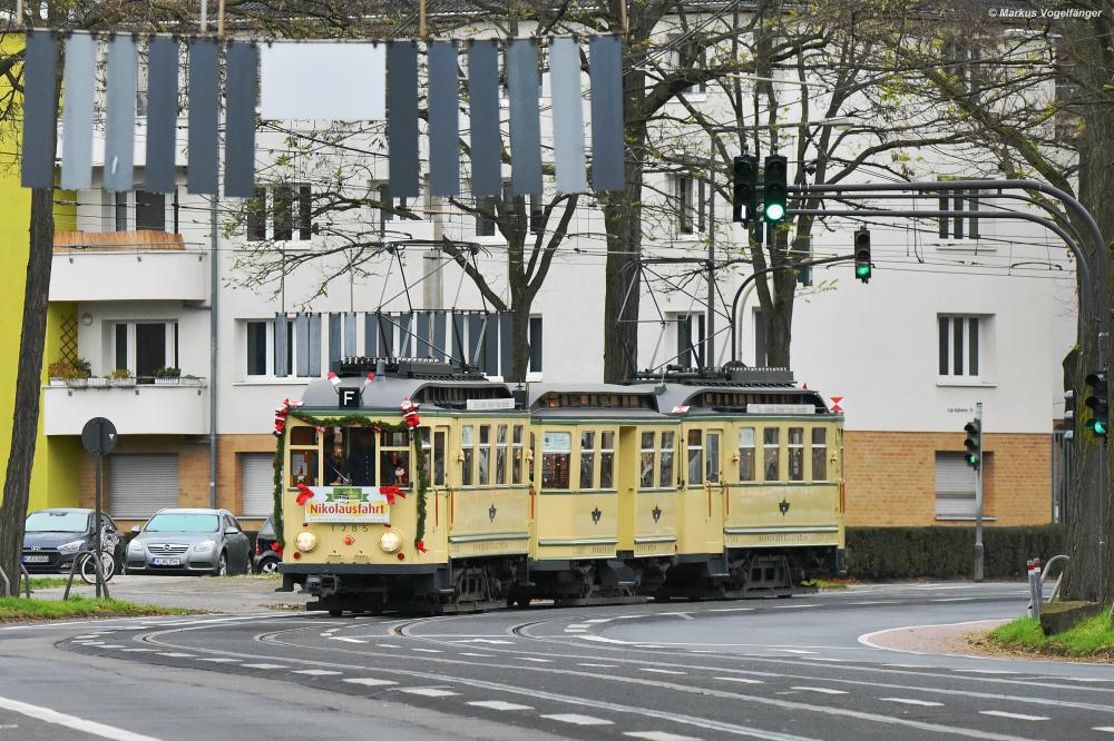 Der historische Museumszug Finchen bestehend aus 1285, 1257 und 1286 auf dem Weg zum Neumarkt um dort die alljährlichen Nikolausfahrten durchzuführen. Hier auf der Karlsruher Straße am 01.12.2019.