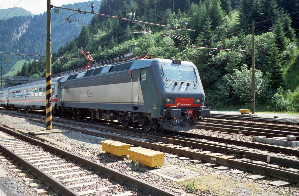 FS-Trenitalia E.405 010 verlässt mit einem aus DB-Wagen gebildeten EC den Bahnhof Brennero/Brenner in Richtung Bolzano/Bozen (28.06.05); digitalisiertes Dia.