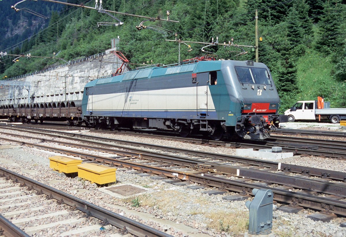 FS-Trenitalia E.405 027 verlässt mit einem Güterzug den Bahnhof Brennero/Brenner in Richtung Bolzano/Bozen (30.06.2005); digitalisiertes Dia.