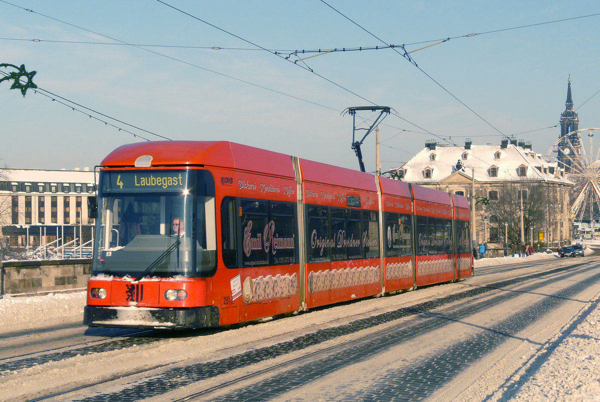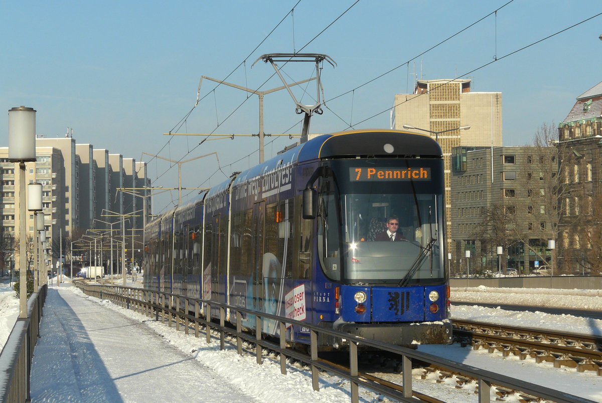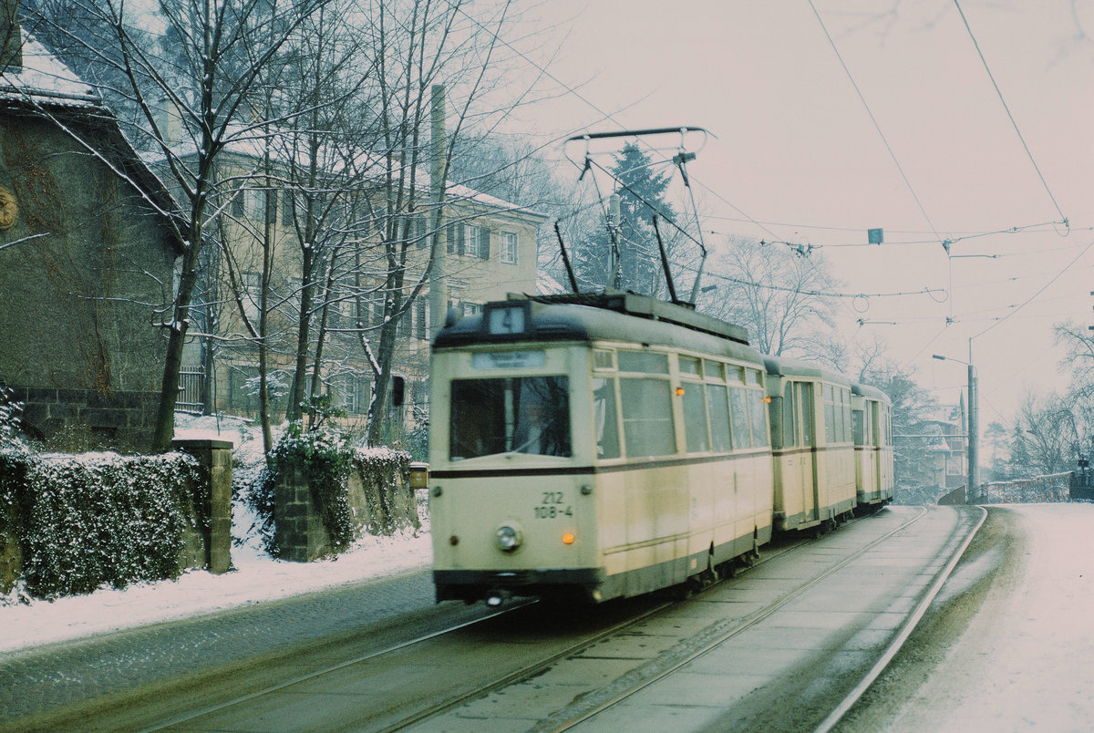 Am 19. Januar 1985 fährt ein Zug der Linie 4 der Dresdner Straßenbahn auf der engen, hügeligen und kurvigen Pillnitzer Landstraße stadtwärts. Hier befindet er sich in Loschwitz in der Nähe der Haltestelle "Künstlerhaus".
