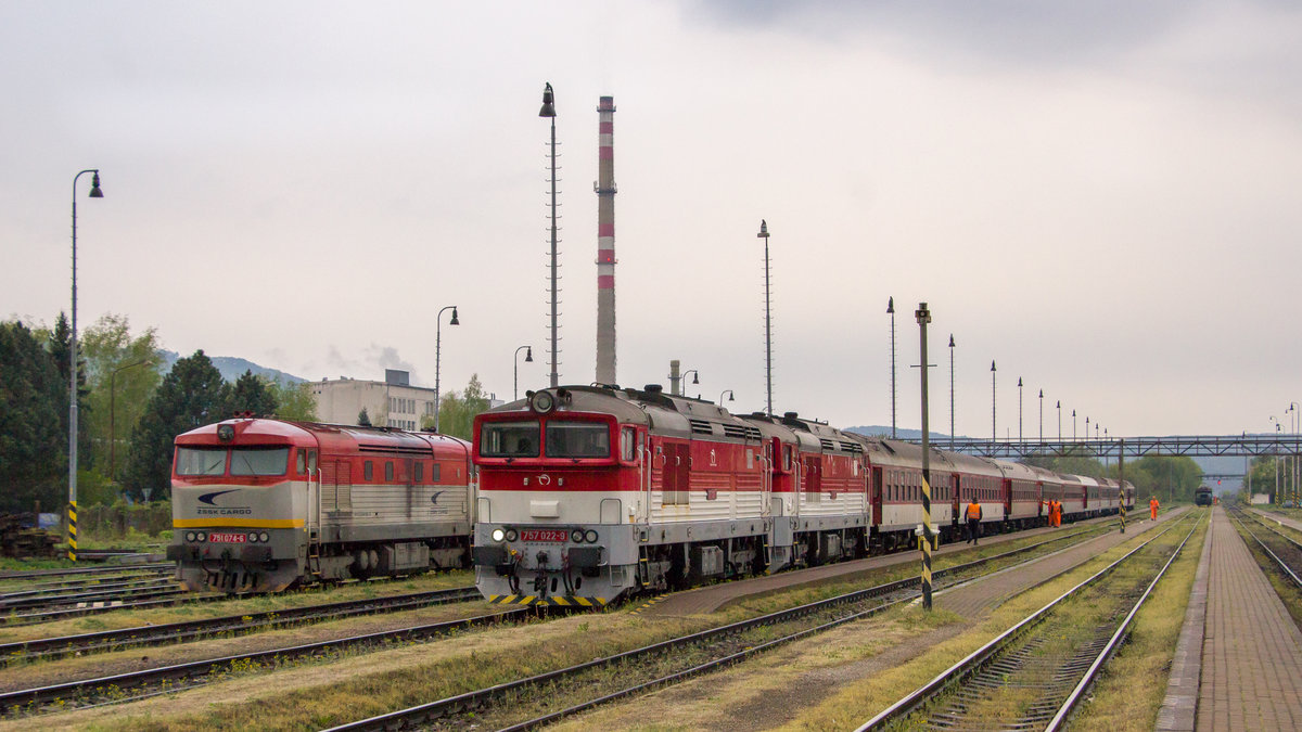23. April 2019 in Humenné: Großes Dieseltreffen am frühen Morgen. Der Nachtzug aus Bratislava hatte nach Lokwechsel 757 022-9 + 757 024-5 als Zugpferde zum Vorschein gebracht. Daneben stand abgestellt 751 074-6.
