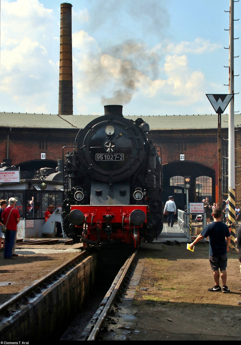 95 1027-2 der Traditionsgemeinschaft 50 3708 e.V. rangiert auf die Drehscheibe des östlichen Ringlokschuppens des Sächsischen Eisenbahnmuseum Chemnitz-Hilbersdorf e.V. (SEM), um als Kulisse für das Gruppenfoto mit allen Verantwortlichen und Beteiligten des 28. Heizhausfests zu dienen.