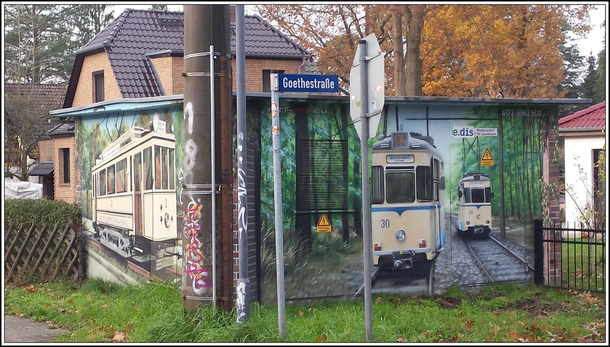Hübscher Garagenschmuck mit den Tramwagen 2, 30 und 28 der Strassenbahnlinie 87 in der Goethestrasse. (17.11.2019)