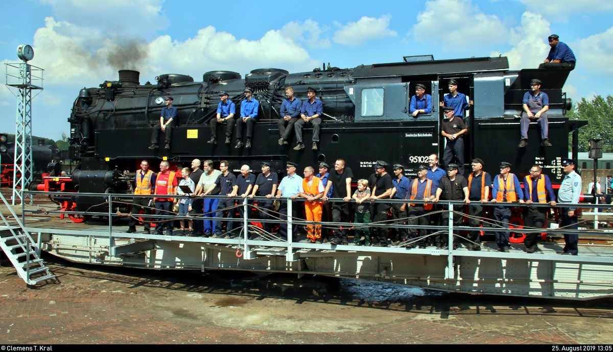 Beim 28. Heizhausfest haben sich am Sonntagmittag alle Verantwortlichen bzw. Beteiligten auf der östlichen Drehscheibe des Sächsischen Eisenbahnmuseum Chemnitz-Hilbersdorf (SEM) versammelt, um für ein abschließendes Gruppenfoto vor 95 1027-2 der Traditionsgemeinschaft 50 3708 e.V. zu posieren.