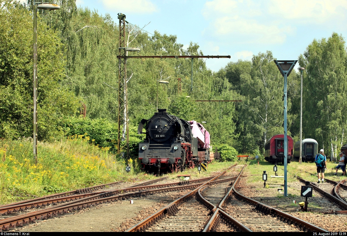 Die vor zwei Jahren beim Heizhausfest entgleiste 23 1019 des Lausitzer Dampflok Club e.V. steht anlässlich des 28. Heizhausfests im nichtöffentlichen Bereich des Sächsischen Eisenbahnmuseum Chemnitz-Hilbersdorf (SEM).