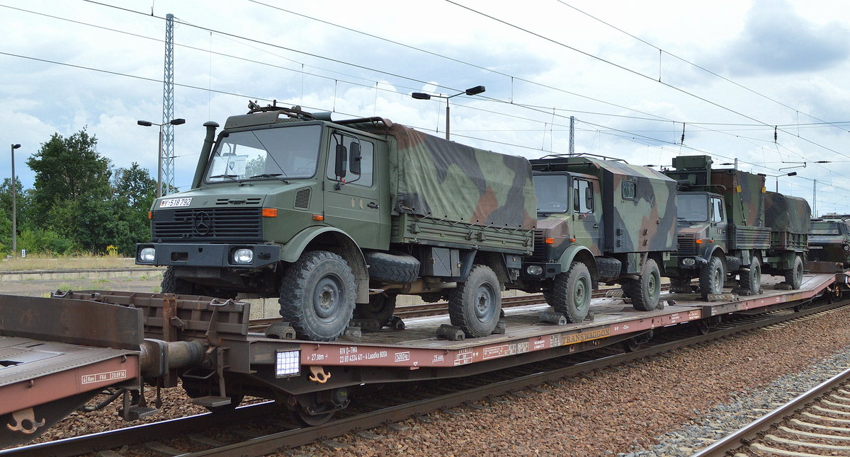 Flachwageneinheit mit abgesenktem Fußboden vom Einsteller TRANSWAGGON mit der Nr. 23 RIV 80 D-TWA 4334 411-4 Laadks 800A Beladen mit drei MB Unimog U 1300 L mit verschiedenen Aufbauten am 07.08.19 in einem Militärzug Bf. Flughafen Berlin Schönefeld.