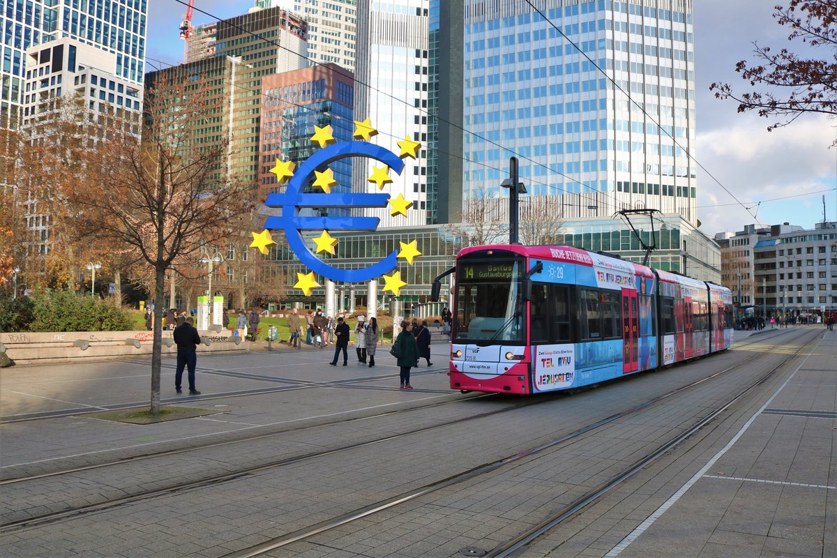 VGF Bombardier Flexity Classic S-Wagen 235 am 30.11.19 am Willy Brandt Platz in Frankfurt am Main mit neuer Tel Aviv Vollwerbung