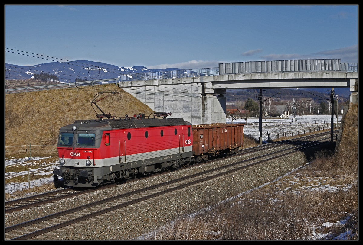 1144 233 mit einem Ein-Wagen-Güterzug kurz vor Knittelfeld am 4.02.2019.