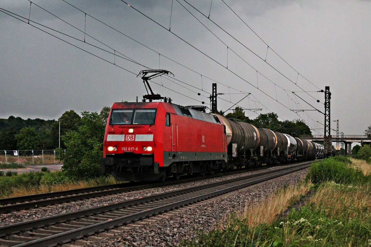152 017-0 am 21.07.2017 bei leichtem Regen mit einem Kesselzug südlich von Buggingen im Markgräflerland und fuhr gen Freiburg (Breisgau).