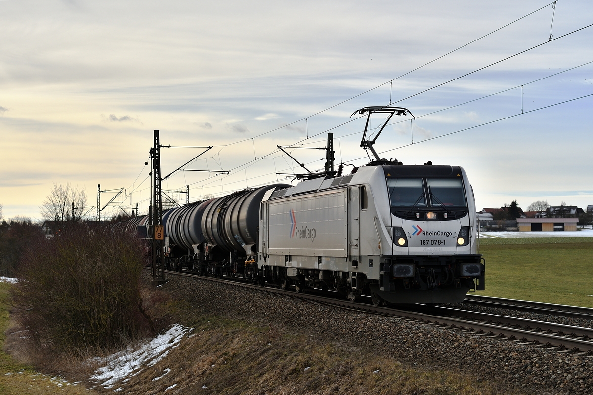 187 078 von RheinCargo zog am 9. Februar 2019 einen Kesselzug durch Westerstetten.