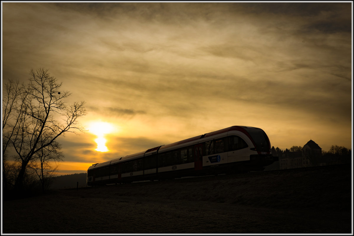 Die Silhouette von Schloss Welsberg erwacht mit den Sonnenstrahlen aus seinem "Dornröschenschlaf. 9.02.2019