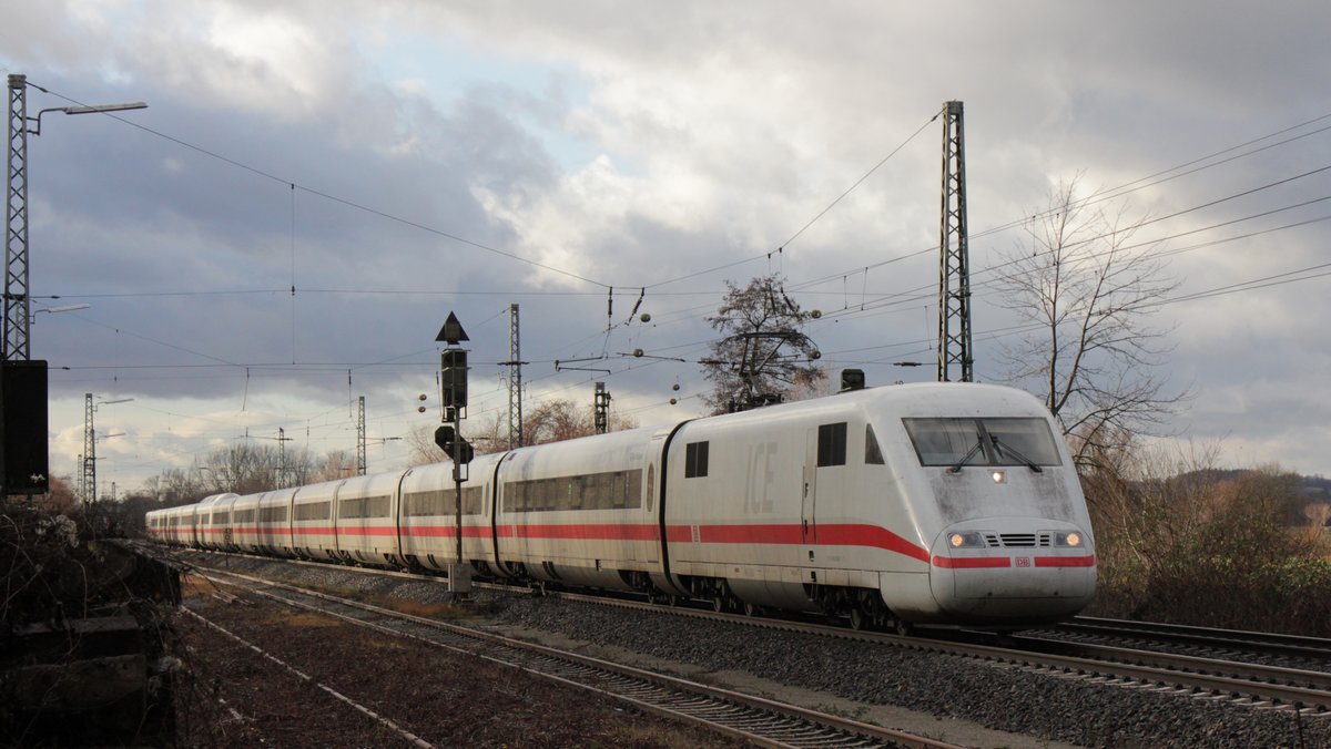 Winter bei Bern-Ostermundigen; Blick auf den Motorwagen ICE 401 572 mit seinen zwei Pantographen (DB/SBB) bei der Vorbeifahrt Richtung Berlin. 29.Januar 2019