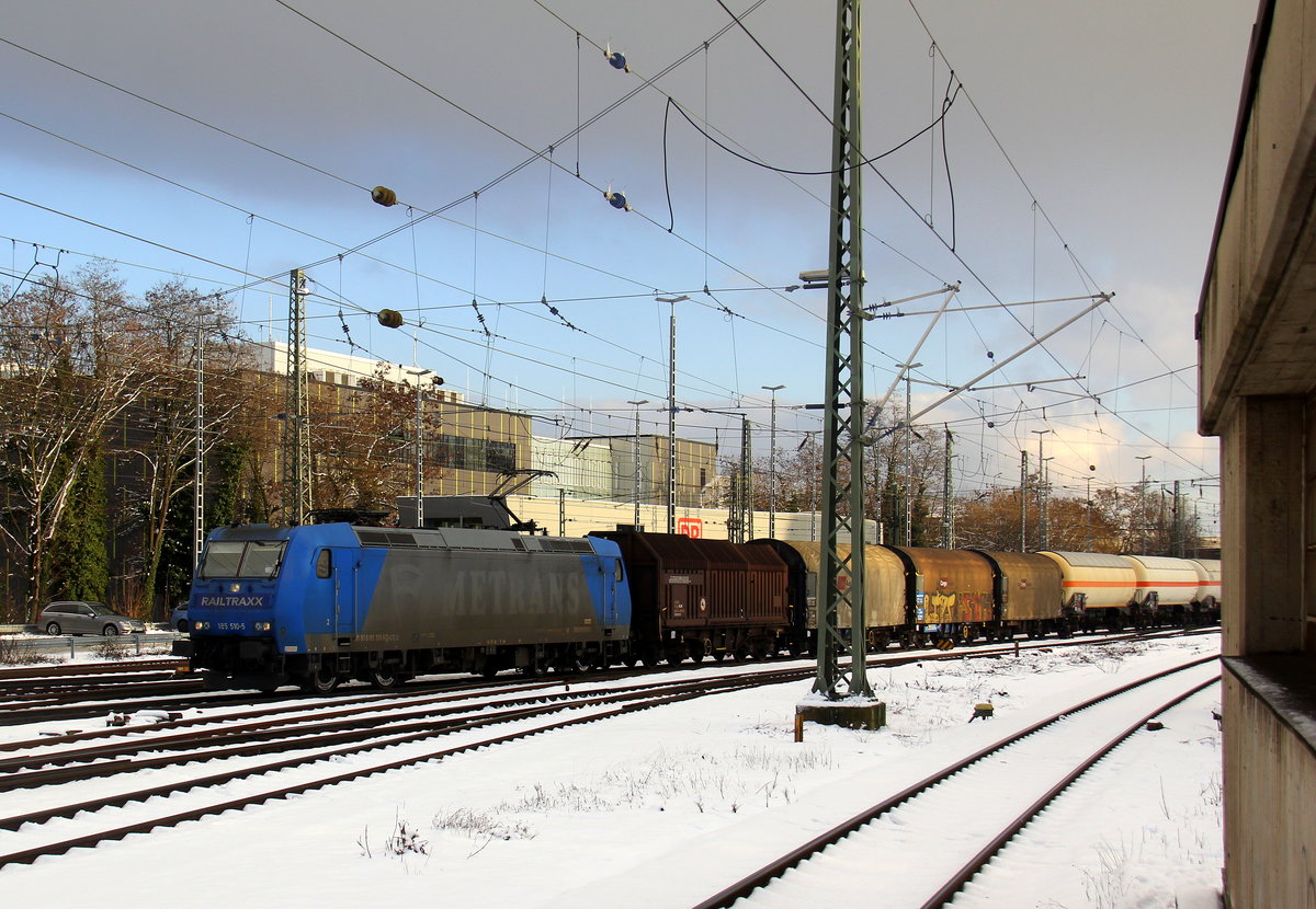 185 510-5 von Railtraxx kommt aus Richtung Köln,Aachen-Hbf,Aachen-Schanz mit einem schweren gemischten Güterzug aus Linz Voestalpine(A) nach Antwerpen Waaslandhaven(B) und fährt in Aachen-West ein. Aufgenommen vom Bahnsteig in Aachen-West. Bei Sonne und Schnee am Kalten Nachmittag vom 31.1.2019.