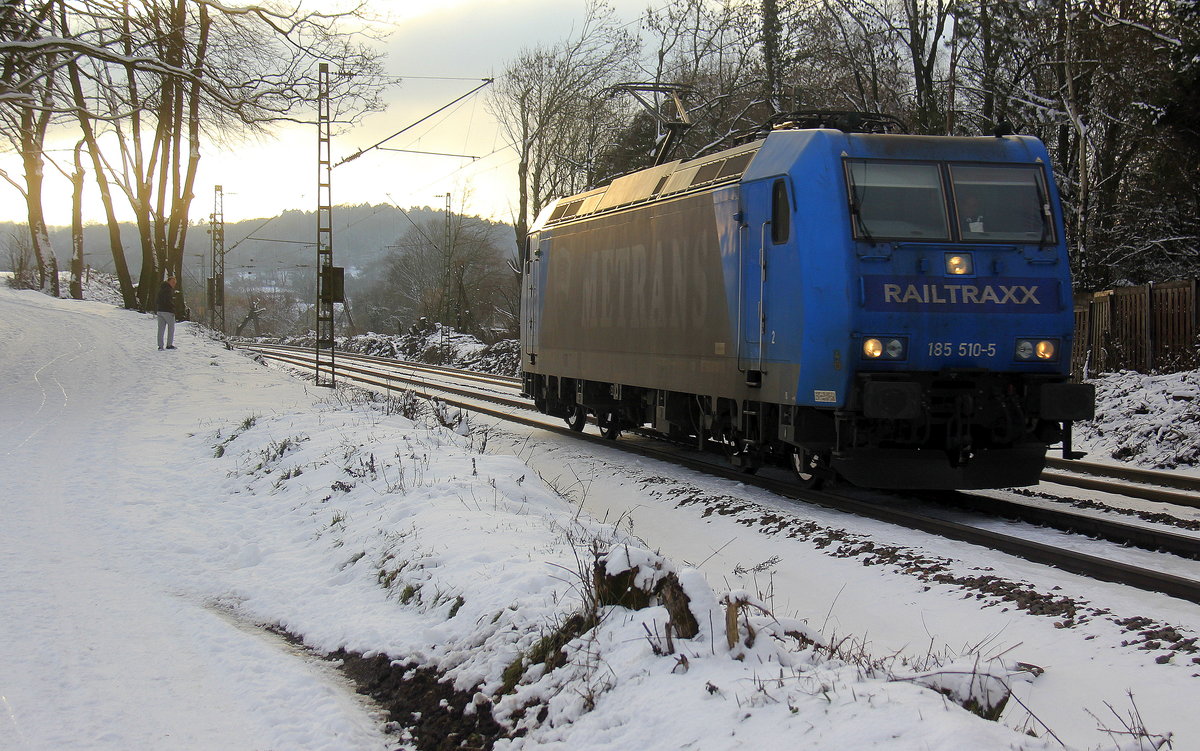 185 510-5 von Railtraxx kommt von einer Schubhilfe vom Gemmenicher Tunnel zurück nach Aachen-West. Aufgenommen an der Gemmenicher-Rampe am Gemmenicher-Weg auf dem Montzenroute. Bei Sonne und Schnee am Kalten Nachmittag vom 31.1.2019.