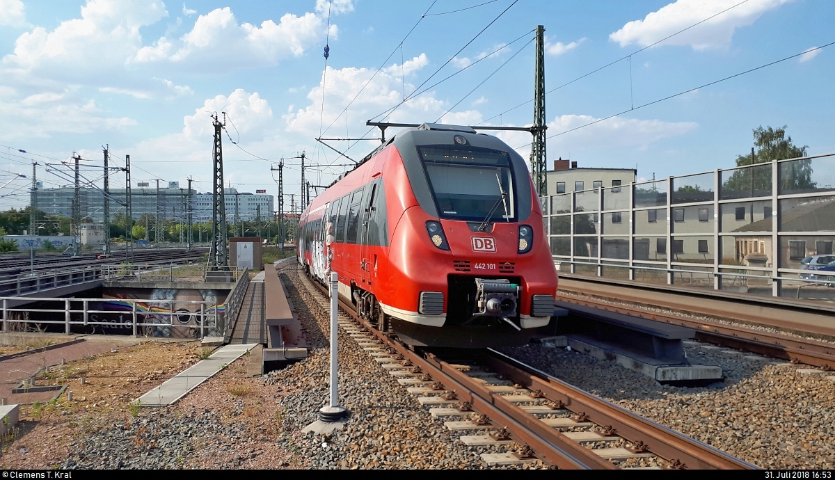 442 101 (Bombardier Talent 2), ex S-Bahn Mitteldeutschland (DB Regio Südost), als S 37748 (S7) nach Halle-Nietleben kommt außerplanmäßig und bereits verspätet aus der Abstellung und wird in ihrem Startbahnhof Halle(Saale)Hbf Gl. 13a bereitgestellt. Nach dem Einsteigen hieß es aber noch zu warten, denn der Bahnübergang in der Karl-von-Thielen-Straße hatte eine Störung, sodass sich die Verspätung verlängerte. [31.7.2018 | 16:53 Uhr]