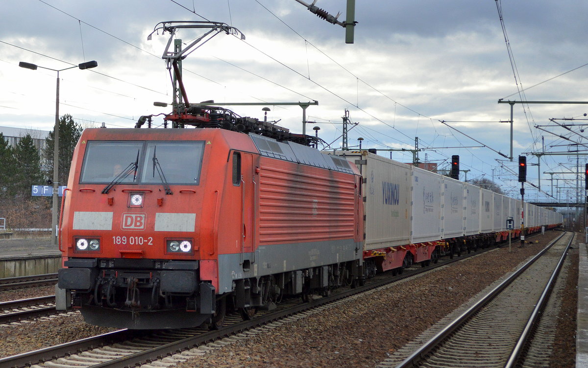 DB Cargo Deutschland AG mit  189 010-2  [NVR-Number: 91 80 6189 010-2 D-DB] und einem Containerzug für die chinesische Überland-Bahnstrecke, ungewöhnlich da eigentlich bisher hauptsächlich die privaten EVU + PKPC diese Güter-Relationen über Polen von u. nach Deutschland bewegt haben, 28.01.19 BF. Flughafen Berlin-Schönefeld.
