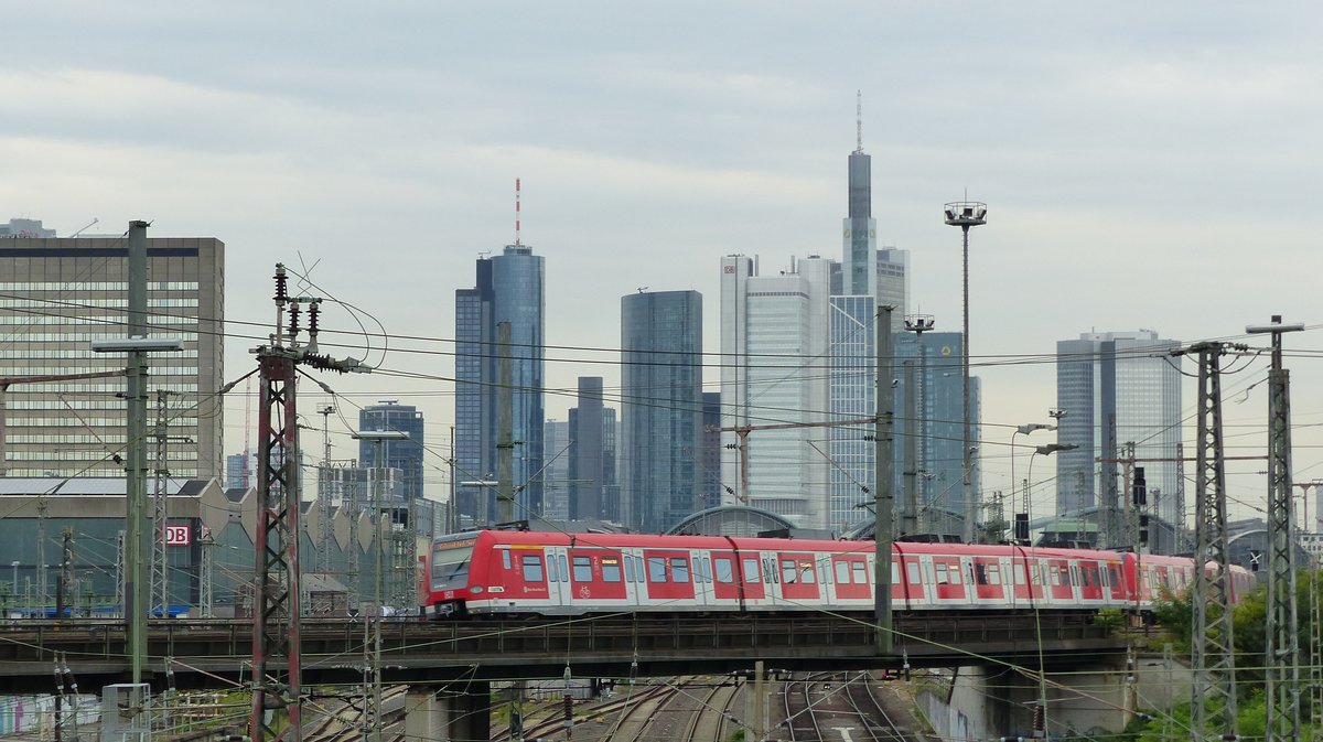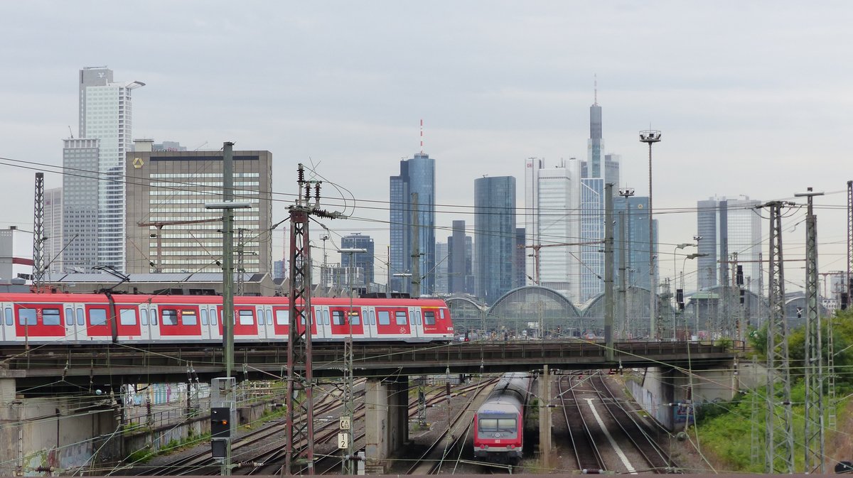 Ein 423 präsentiert sich kurz vor dem Abtauchen in den Citytunnel noch einmal vor der Frankfurter Skyline. Fotografiert vom 8.8.2017 12:37