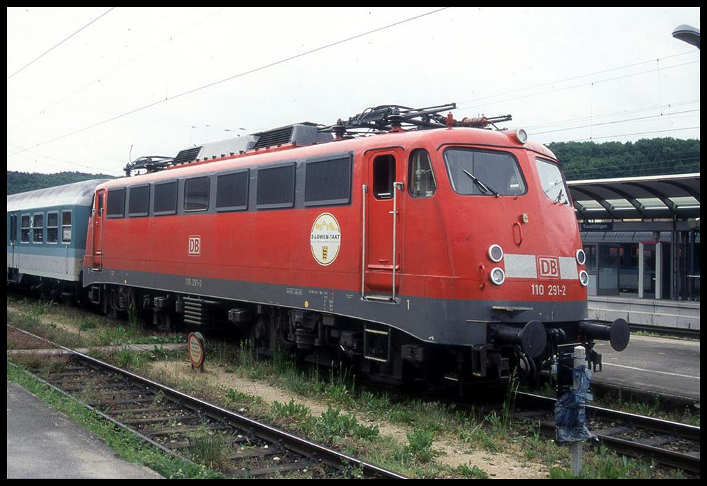 Elektrolok 110291 mit RB am 31.5.2001 im Bahnhof Treuchtlingen.