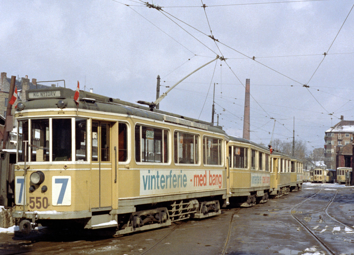 København / Kopenhagen Københavns Sporveje SL 7 (Tw 550 + Bw 15**) København N, Nørrebro Remise (: Straßenbahnbetriebsbahnhof Nørrebro) am 28. März 1970. - Der 28. März war der Geburtstag der Königin Ingrid (1910 - 2000), die mit dem damaligen dänischen König, Frederik IX (1899 - 1972), verheiratet war; wegen des Geburtstages der Königin waren u.a. die Straßenbahnen mit Fahnen geschmückt. - Scan eines Farbnegativs. Film: Kodak Kodacolor X.