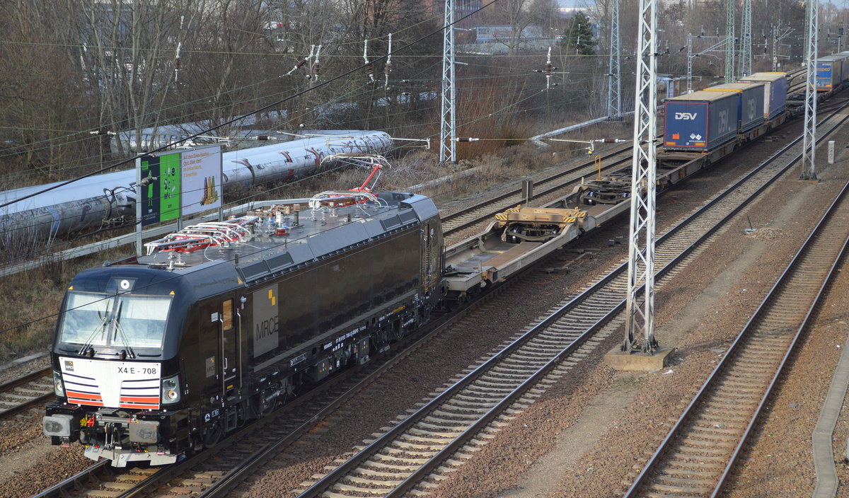 Mieter: Mercitalia Rail S.r.l.? In meinem Augen eine TXL-Leistung mit der MRCE Vectron "X4 E - 708" [NVR-Number: 91 80 6193 708-5 D-DISPO] mit KLV-ZUg ab Rostock am 31.01.19 Berlin-Springpfuhl.