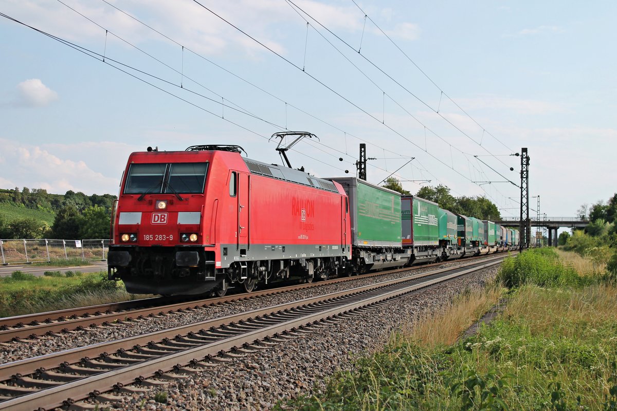 In Magdeburg Sudenburg ist am 9. September 2018 die 185 615-2 mit einem Ganzzug zugegen. Im Hintergrund 203 301-7 von DB-Netz.