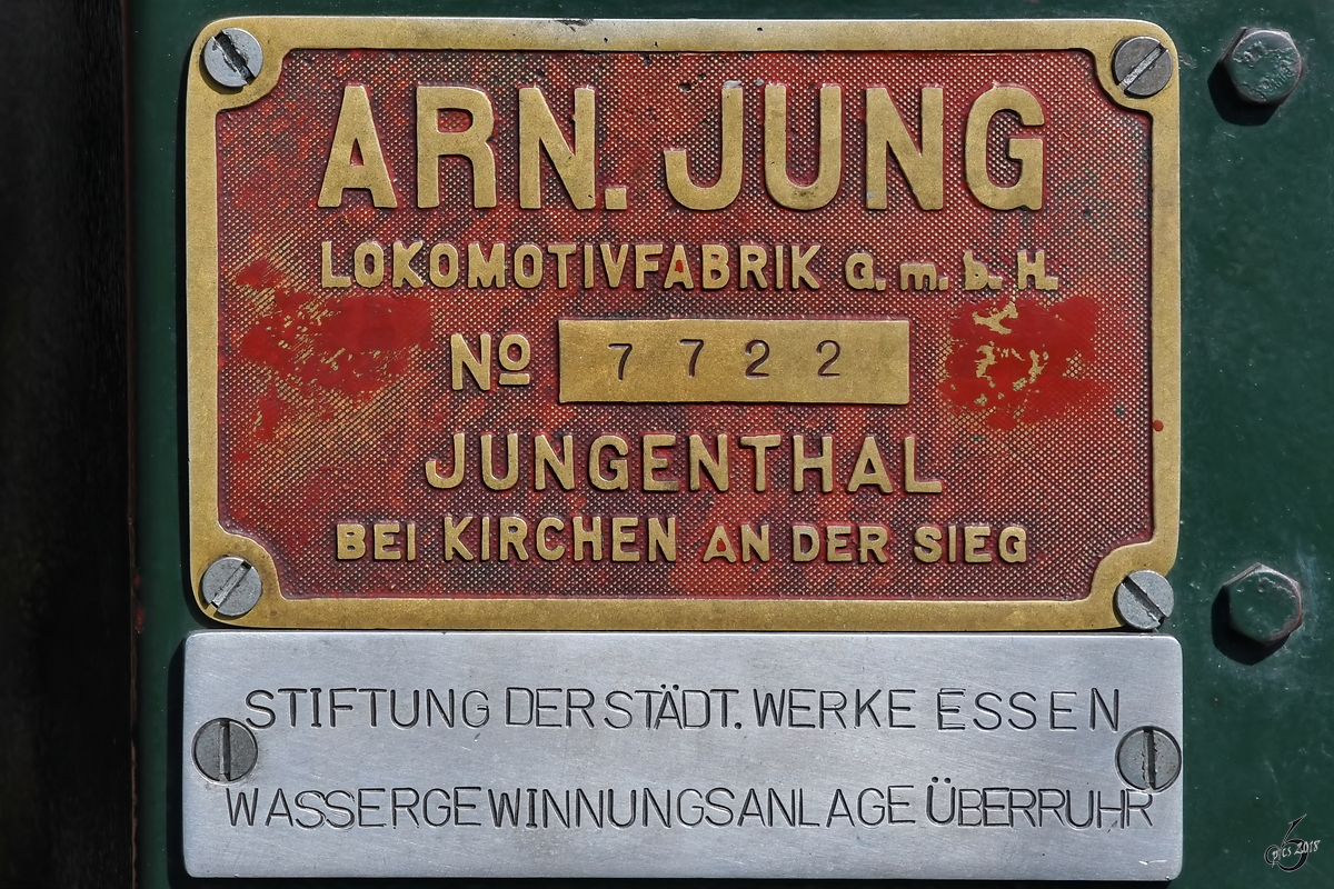 Typenschild an der Feldbahndiesellok V2 von Jung. (Eisenbahnmuseum Bochum-Dahlhausen, September 2018)
