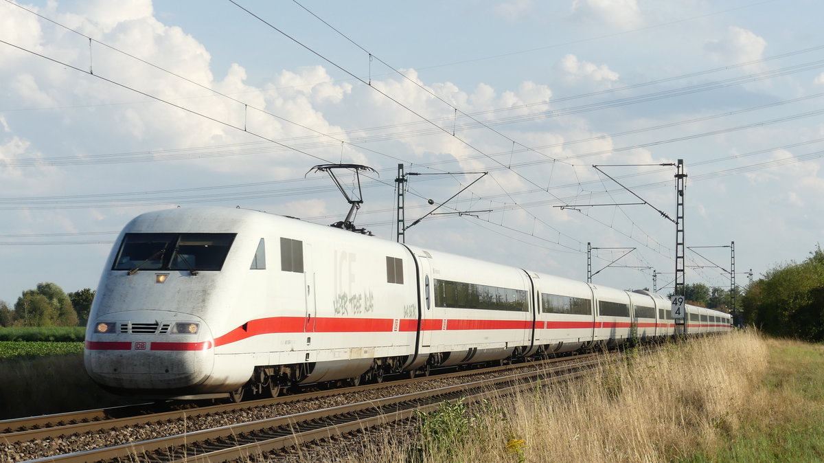 Ein ICE 1 unterwegs als ICE nach München oder Basel auf der Riedbahn zwischen Groß-Gerau Dornheim und Riedstadt Wolfskehlen. Aufgenommen am 22.8.2018 18:13