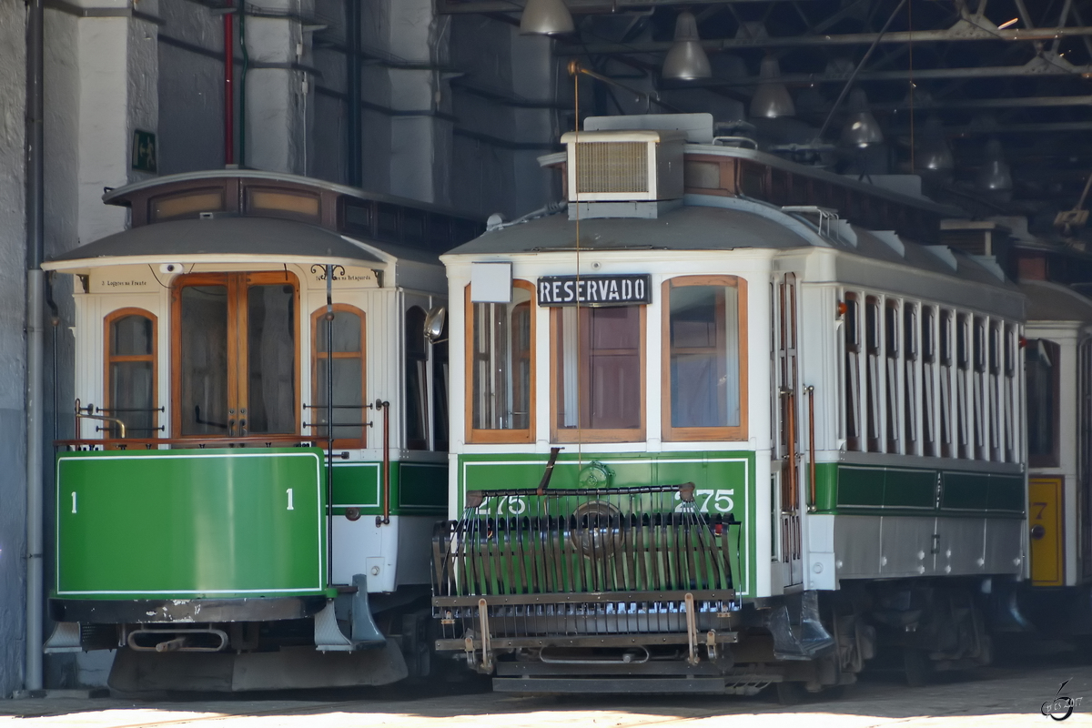 No.1 wurde als Beiwagen in den ersten Jahren des 20. Jahrhunderts gebaut, No.275 ist einer der Nachbauten des ersten Straßenbahnwagens mit Drehgestellen der US-amerikanischen J. G. Brill Company. (Museu do Carro Eléctrico Porto, Januar 2017)