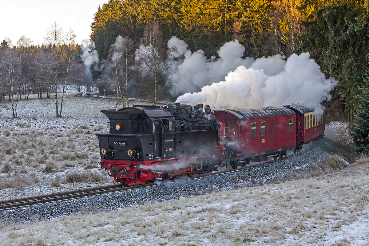 Der 99 6001 mit dem Planzug zwischen Bahnhöfe Sternhaus Ramberg und Gernrode am 6. Januar 2017.
