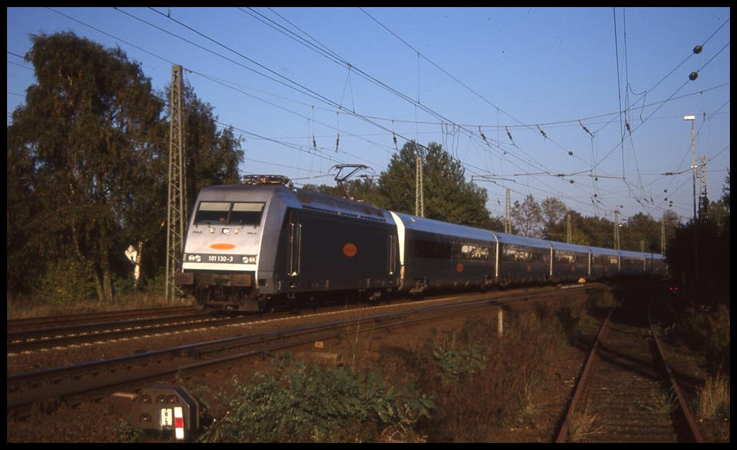 Der Metropolitan mit Zug Lok 101130 ist hier am Ortsrand von Hasbergen kurz vor der Landesgrenze zu Nordrhein Westfalen am 19.10.1999 um 16.50 Uhr in Richtung Köln unterwegs.