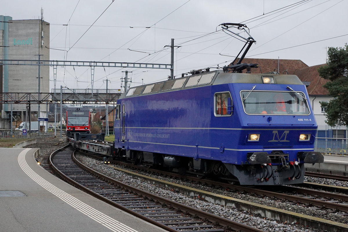 Am 5. Dezember 2018 brachte die 456 111-4 den frisch revidierten Be 2/6 511 (ehemals MVR) von Bussnang nach Ins zur ASm/BTI.