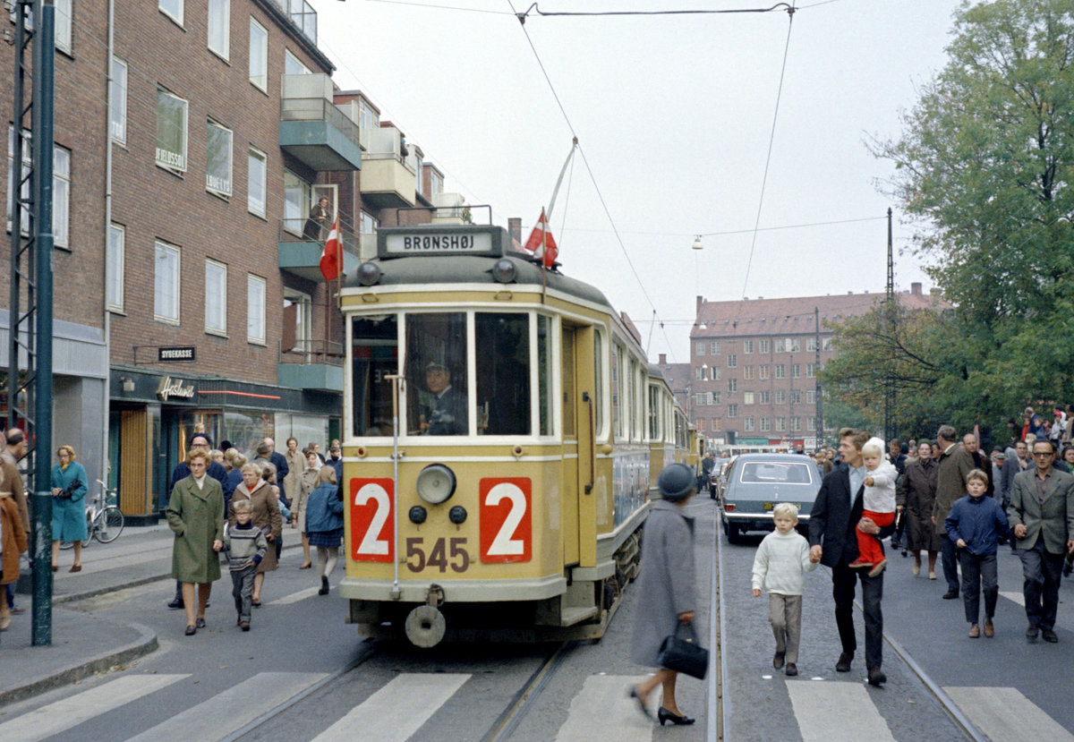 København / Kopenhagen Københavns Sporveje (KS): In den 1960er Jahren waren die Kopenhagener Politiker und die Verwaltung der KS in vollem Gang damit, die Lebens- und Verkehrsverhältnisse in Kopenhagen zu verringern. In diesen Jahren wurden viele Straßenbahnlinien eingestellt; man versuchte, einen großen Teil dieser Linien durch Dieselbusse zu ersetzen. Das Ergebnis: geringere Angebote mit viel weniger Plätzen und einem schlechteren Komfort - und eine Verringerung der Stadtumwelt. Viele Politiker wollten mehr Platz für den Autoverkehr und viele verließen den öffentlichen Verkehr zugunsten der Autos. - In Verbindung mit der Einstellung der SL 2 machte die KS am Sonntag dem 19. Oktober 1969 eine Kavalkade von Straßenbahnfahrzeugen, um den Übergang zu einem behaupteten  besseren und modernen Betrieb durch Dieselbusse  zu feiern. - Zum Foto: Die Kavalkade begann in Brønshøj. Die Drehgestellgarnitur bestehend aus dem Tw 545 und dem Bw 15xx befindet sich in Brønshøj (Brønshøjvej / Brønshøj Torv). - Scan eine Farbnegativs. Film: Kodak Kodacolor X.