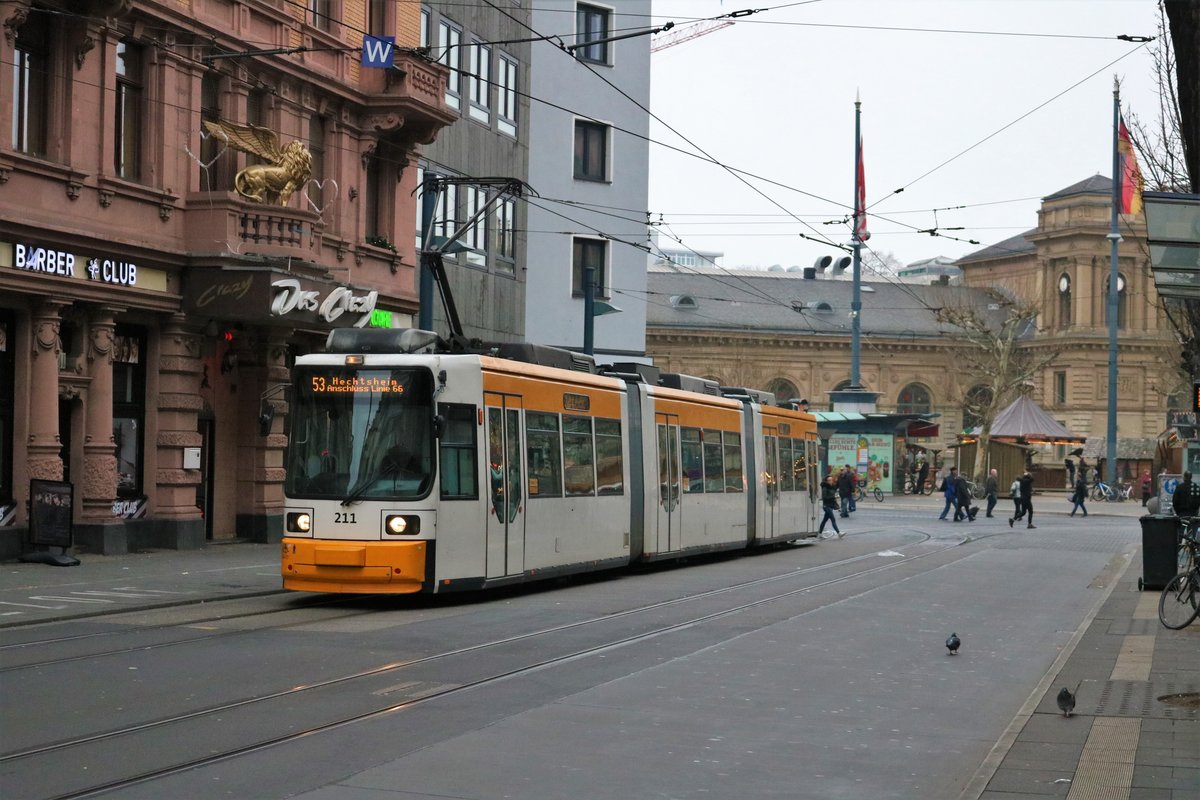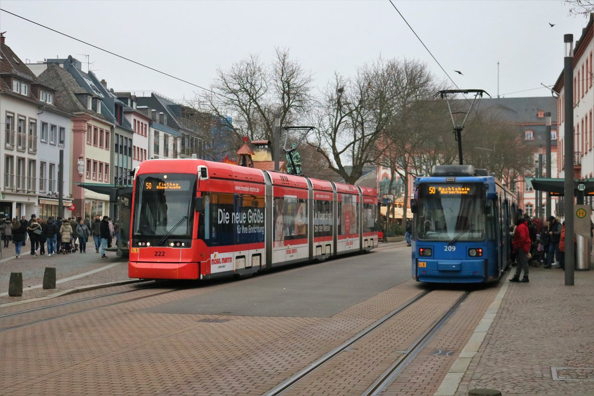 MVG Stadler Variobahn Wagen 222 und Adtranz GT6M-ZR Wagen 209 am 28.12.18 in Mainz Schillerplatz