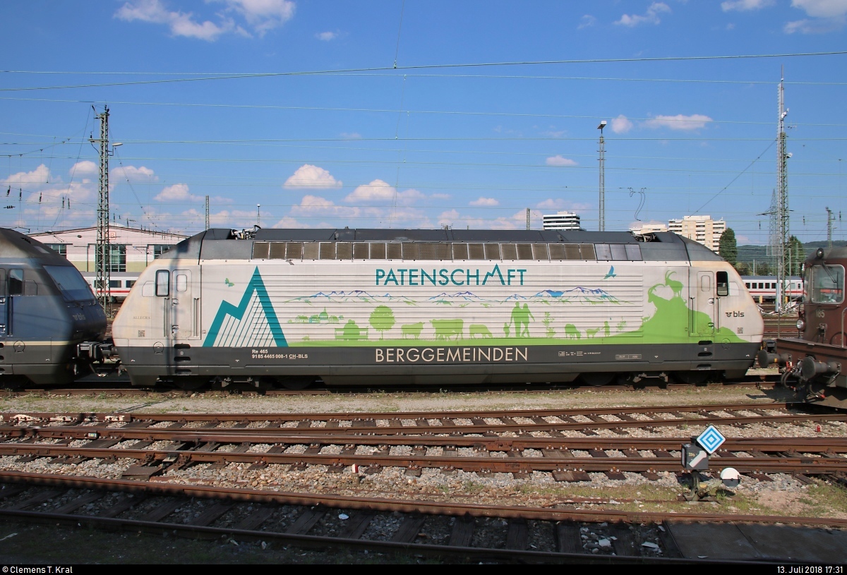 Re 465 008-1 "Allegra", mit Werbung für die "Schweizer Patenschaft für Berggemeinden", der BLS Cargo AG ist im Bahnhof Basel Bad Bf (CH) abgestellt. Aufgenommen vom öffentlich zugänglichen Parkplatz neben der Schwarzwaldallee. [13.7.2018 | 17:31 Uhr]