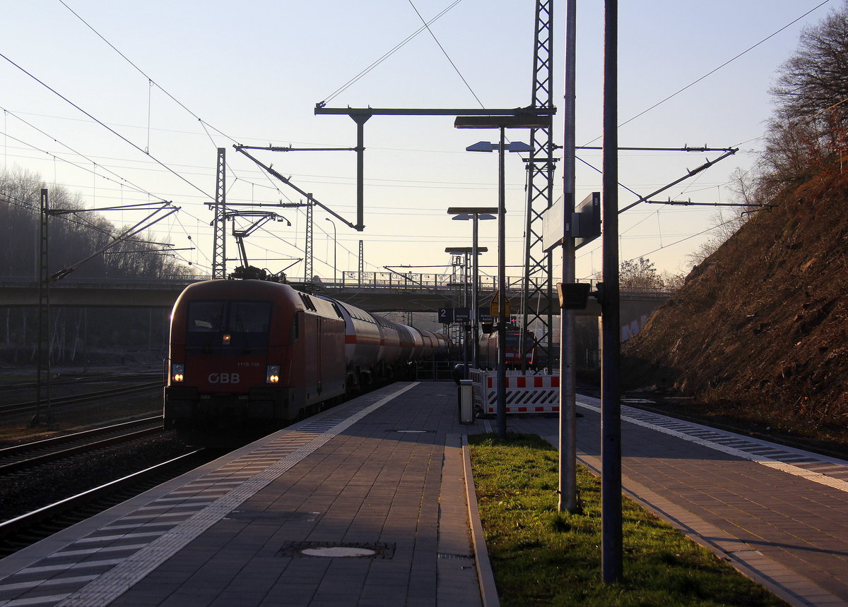 Taurus 1116 168 von ÖBB kommt mit einem gemischten Güterzug aus Antwerpen-Waaslandhaven(B) nach Linz-Voestalpine(A) und kommt aus Richtung Aachen-West,Aachen-Schanz,Aachen-Hbf,Aachen-Rothe-Erde,Aachen-Eilendorf und fährt durch Stolberg-Hbf(Rheinland) in Richtung Eschweiler-Hbf,Langerwehe,Düren,Merzenich,Buir,Horrem,Kerpen-Köln-Ehrenfeld,Köln-West,Köln-Süd. Aufgenommen vom Bahnsteig 1 in Stolberg-Hbf. Bei schönem Winterwetter am kalten Nachmittag vom 28.12.2018.