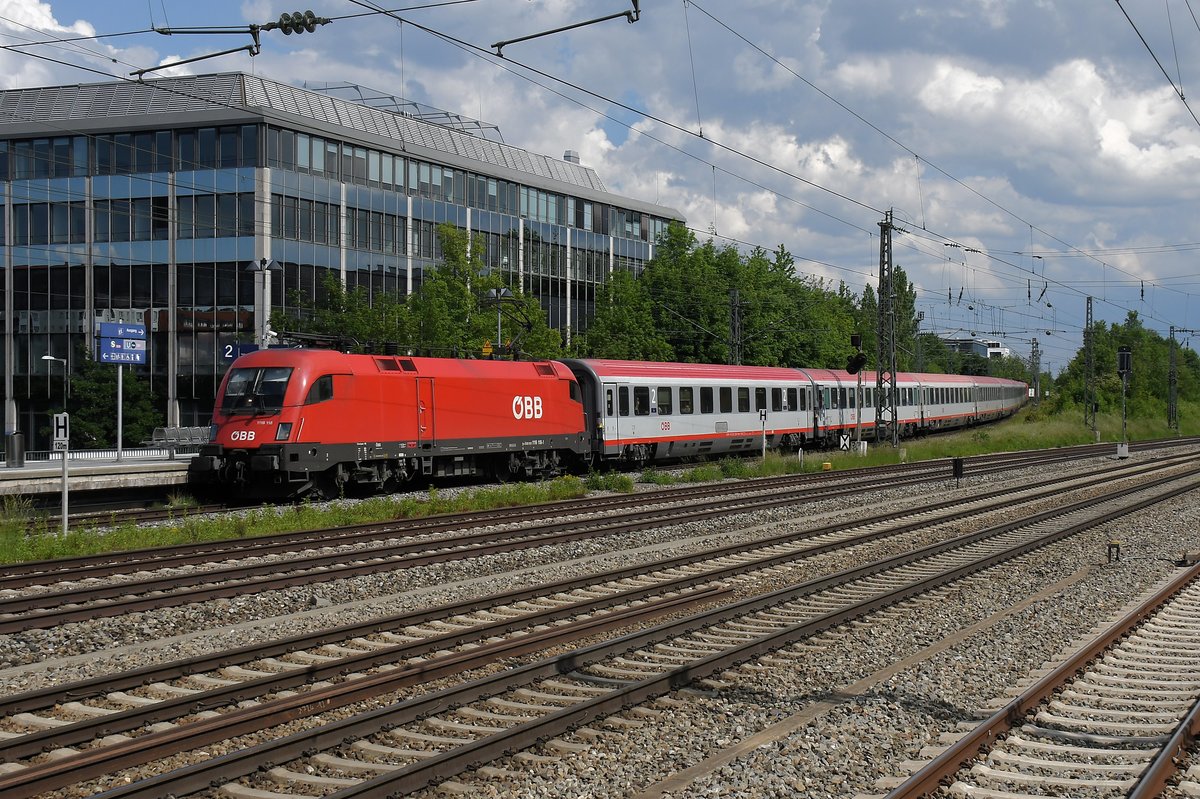 Nachschuss auf 1016 026-7 (Siemens ES64U2) ÖBB, die im Bahnhof Singen(Hohentwiel) vor dem elektromechanischen Stellwerk Sf des Fahrdienstleiters (Fdl) rangiert.