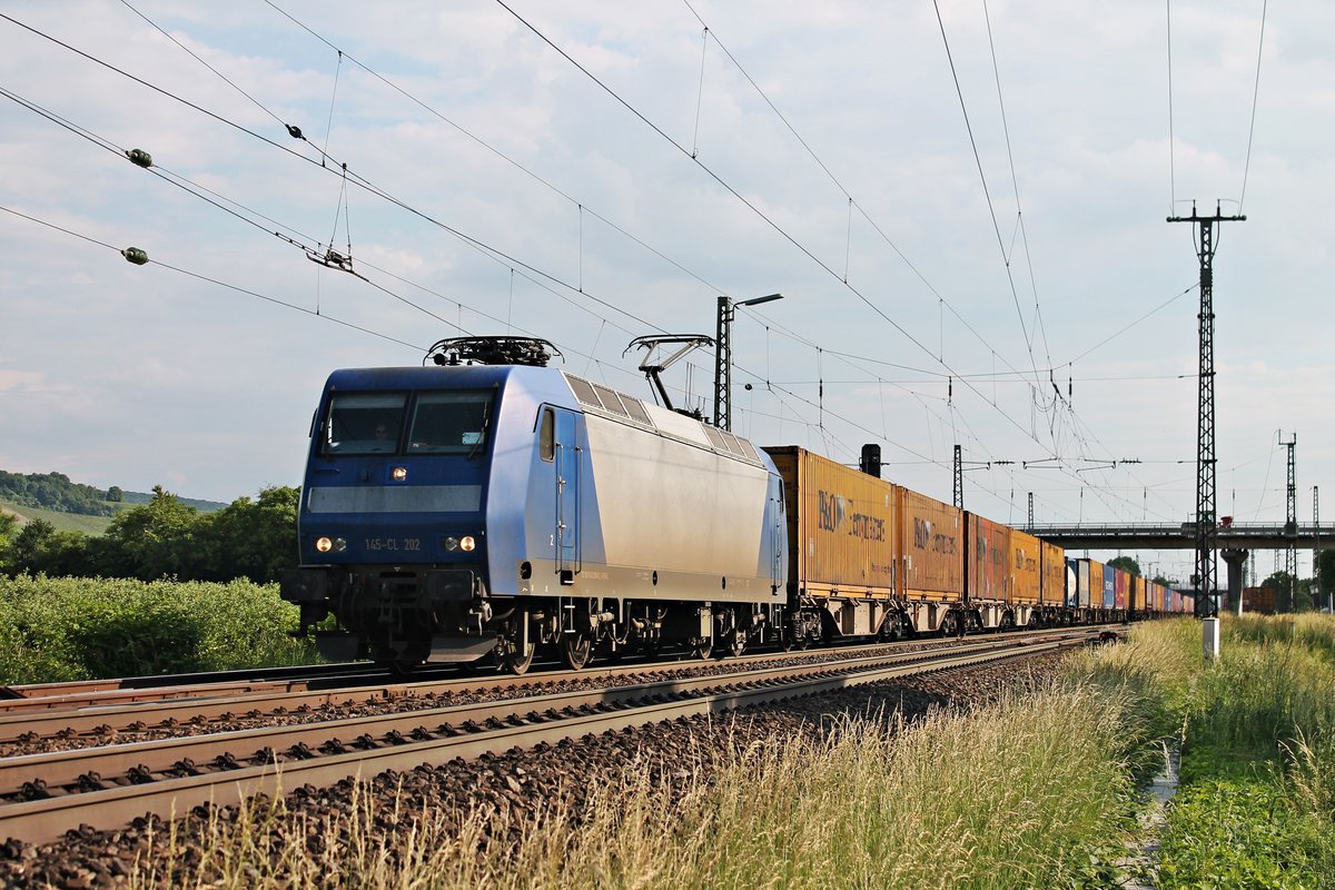 ATLD/XRAIL 145-CL 202 (145 098-0) am Abend des 02.06.2017, als sie einen  P&O -Containerzug nach Aachen West/Belgien bespannte. Hier ist sie mit ihrem Zug bei Müllheim (Baden) gen Norden unterwegs.