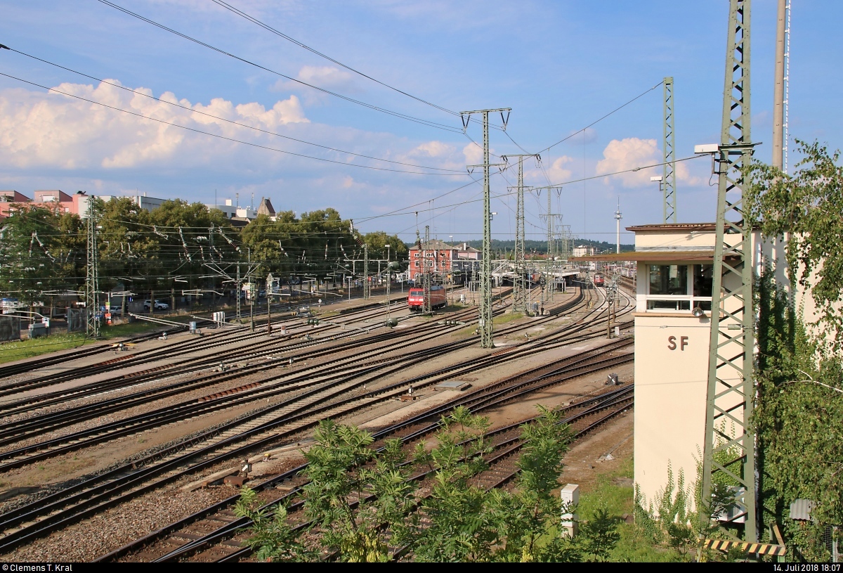 Blick auf den Bahnhof Singen(Hohentwiel) in östlicher Richtung mit rechts angedeutetem elektromechanischen Stellwerk Sf des Fahrdienstleiters (Fdl). Aufgenommen vom Parkhaus in der Julius-Bührer-Straße. [14.7.2018 | 18:07 Uhr]