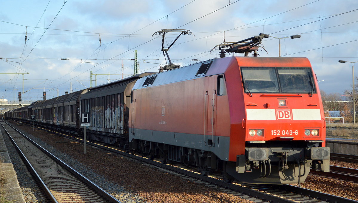 DB Cargo Deutschland AG mit  152 043-6  [NVR-Number: 91 80 6152 043-6 D-DB] und einem Ganzzug Schiebewandwagen am 10.01.19 Bf. Flughafen Berlin-Schönefeld.
