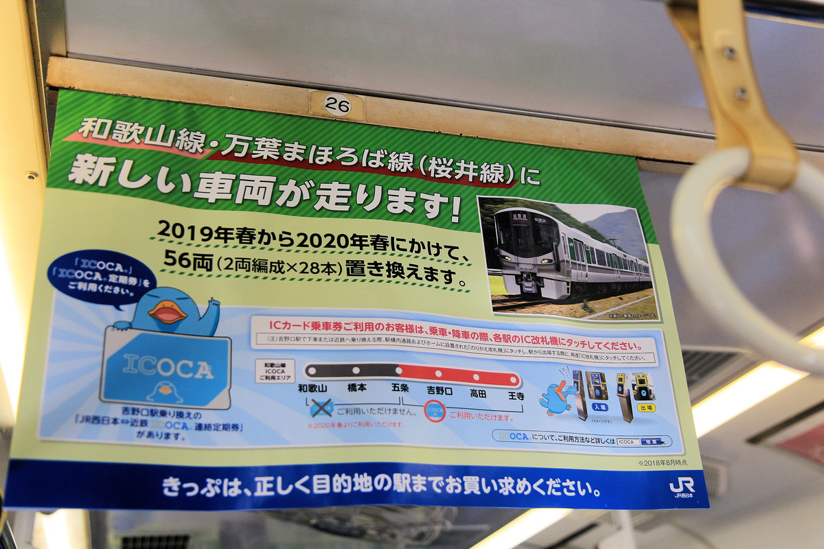 Den alten Wagen Serie 105 im Raum Nara verbleiben nur noch wenige Wochen. Auf einem Infoblatt in den alten Wagen wird das Publikum auf die 28 neuen Züge der Serie 227 aufmerksam gemacht, die im Anrollen sind. Darunter gibt es Information zum Gültigkeitsbereich der Magnetfahrkarte  Icoca . 7.November 2018